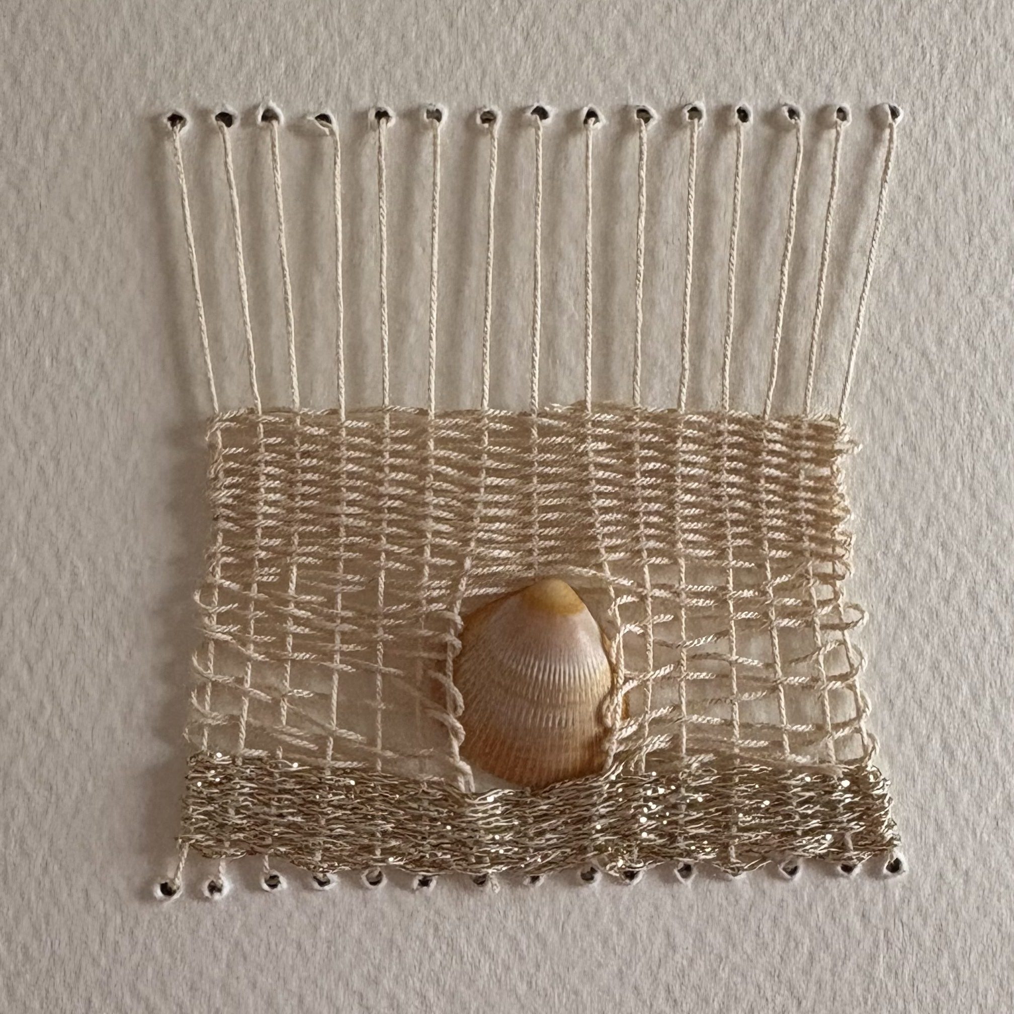 In the image, you can see a weave made of cotton, viscose, and polyester with a small shell that I picked up on the Costa da Caparica.